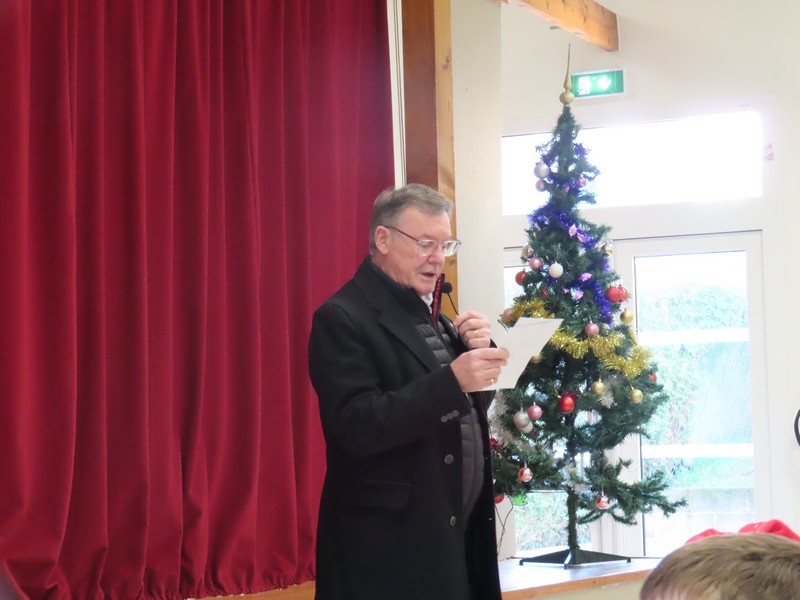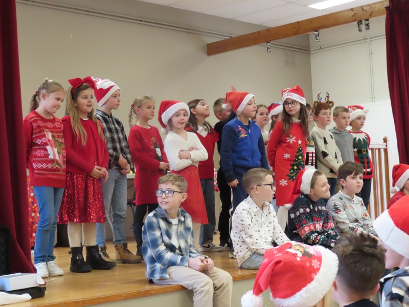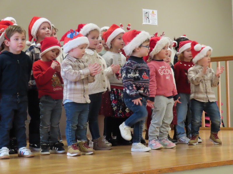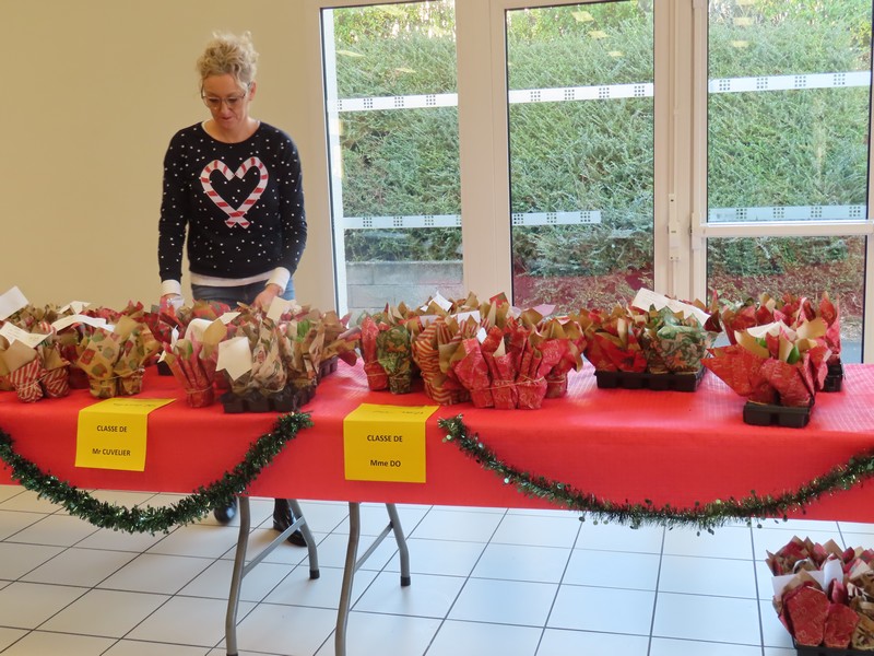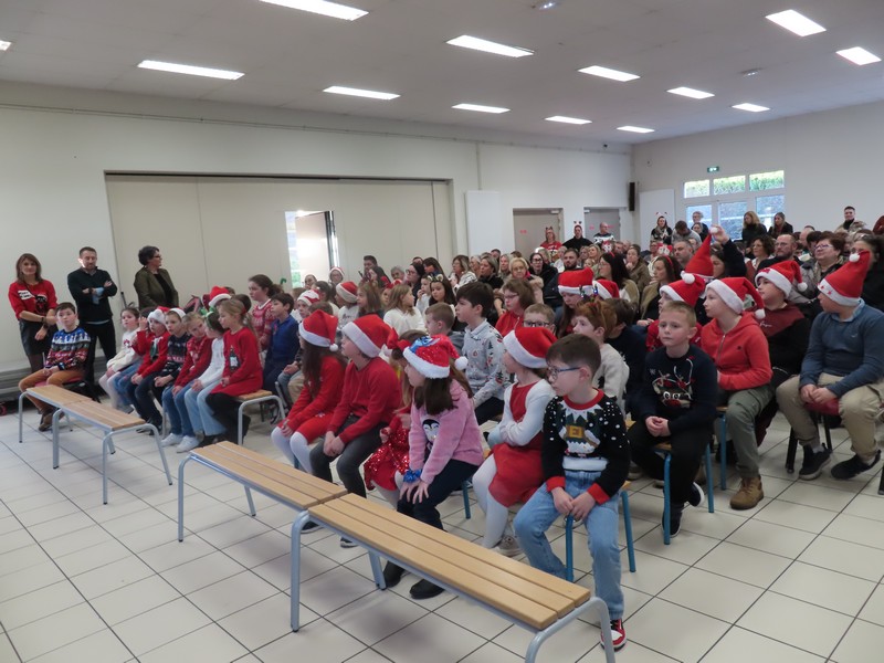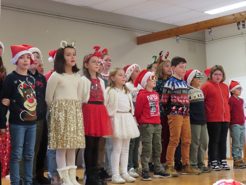 Pour cette nouvelle étape le mardi 16 décembre à la salle de la Marlière, le premier cadeau était pour la présidente de l’APE à qui le maire remettait un chèque de 150 € de la part de la Pizza Lorenza, avant de laisser la place aux enfants qui chantaient déjà à l’intention de celui « qui frappe à la porte, dans son manteau rouge et blanc » ou sur « un rythme de jazz » comme le titrait la deuxième comptine des élèves de maternelle de Mme SISAMOUTH. Et ceux de CP-CE1-CE2 de M. CUVILLIER enchaînaient aussitôt avec le Noël bien connu de la Cie Créole « Bons baisers de Fort de France », suivi d’une « Promenade en traîneau » au son des grelots dans la neige, et de la version bilingue de ce « Petit renne au nez rouge » devenu le héros d’un film d’animation américain, deux chansons interprétées par les CE2-CM1-CM2 de Mme DO NASCIMENTO.