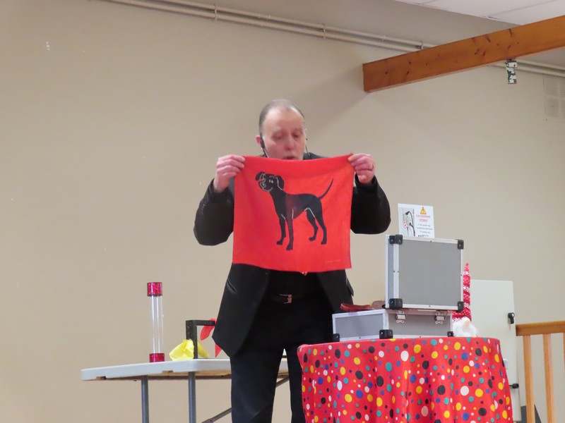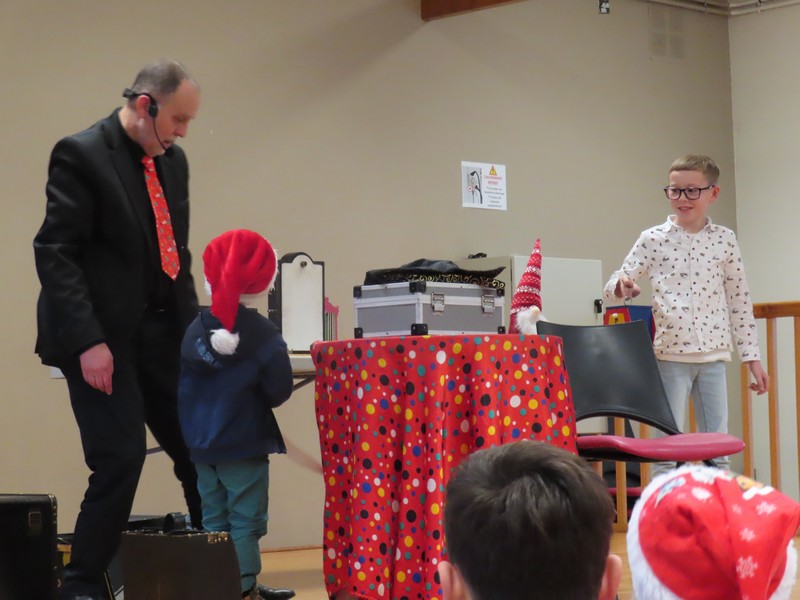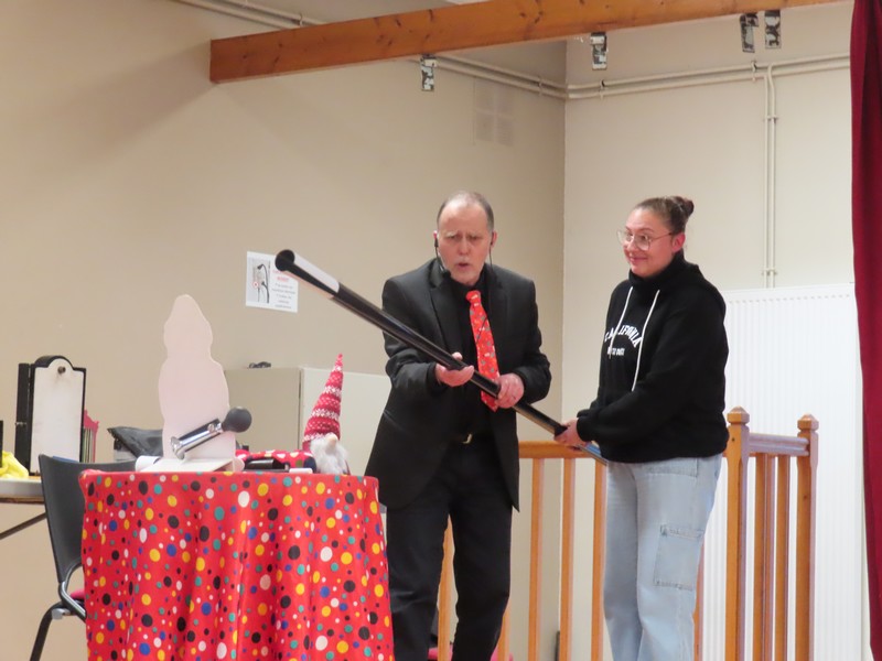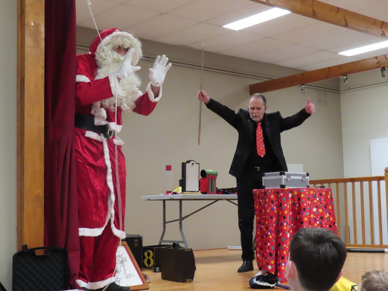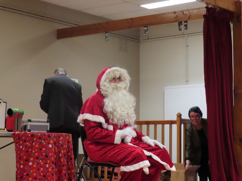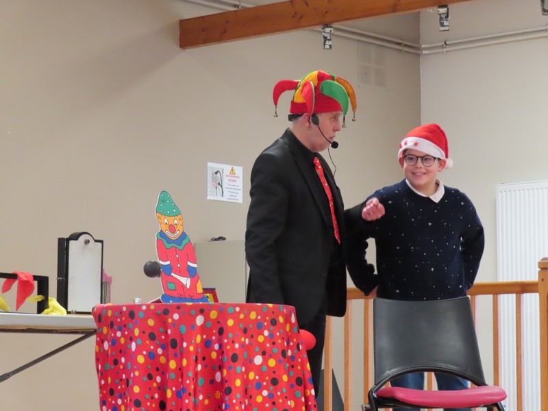 Mais le bonhomme en rouge et blanc se faisait toujours attendre et le spectacle s’est poursuivi avec le magicien invité par l’APE pour distraire les petits et même les grands au gré de ses facéties autant que par ses petits tours de magie, en les interpellant dans la salle ou en les invitant sur scène, jusqu’à un dernier tour de prestidigitation pour faire enfin apparaître le Père Noël. La distribution des cadeaux pouvait commencer tandis que les enfants retrouvaient leurs familles pour partager un morceau de gâteau et boire un chocolat chaud préparés par les parents d’élèves.