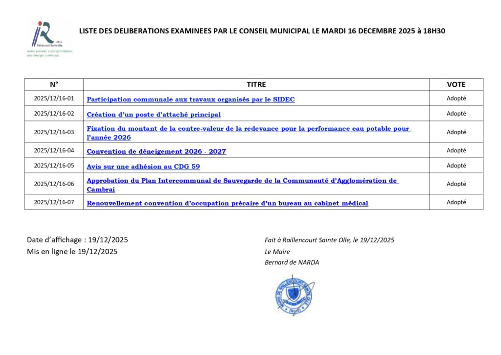 Convocation / ORDRE DU JOUR : CONSEIL DU 16 Décembre 2025