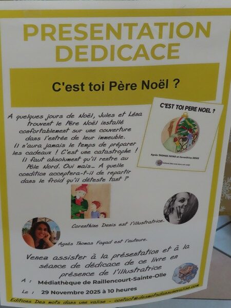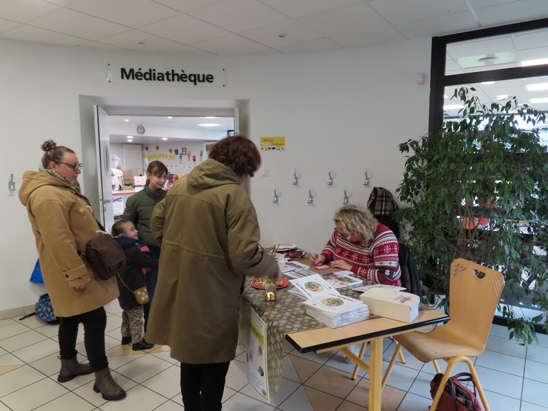 Elle fait partie depuis longtemps de l’équipe enseignante de l’école Joseph Ringeval et chaque année elle se lance dans de nouvelles actions avec sa classe. Mais aujourd’hui Corenthine DENIS nous fait partager un talent plus personnel que même ses élèves pouvaient ignorer. Elle était en dédicace ce samedi 29 novembre à la médiathèque pour accompagner la publication d’un album qu’elle a elle même joliment illustré, une histoire sur le père Noël écrite par Agnès THOMAS FAYAD. C’est parce qu’elle a répondu à une petite annonce via son groupe Facebook, qu’elle s’est lancée dans cette nouvelle aventure en dessinant et coloriant à la main chaque scène que lui soumettait la maison d’édition. Et d’ailleurs elle agrémentait sa dédicace pour les quelques lecteurs qui l’ont rencontrée en peignant sur place une de ces images, leur laissant le plaisir de découvrir cette histoire d’un Père Noël de circonstance, où le cadeau ne vient pas forcément de celui que l’on croit ! Un album plein de fraîcheur et de bons sentiments à lire ou à